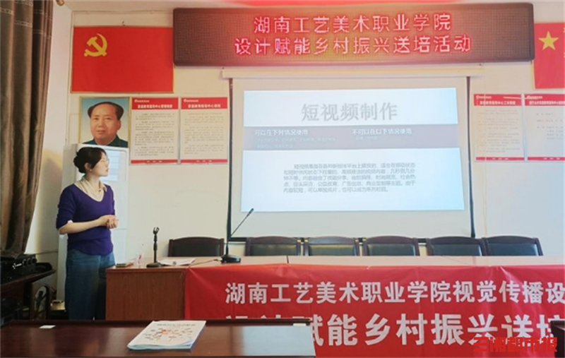 一方面,学校结合乡村实际需求,由名师大师领衔,开展“送技下乡”行动,定期派遣专业教师团队深入乡村,开展民间工艺品制作、短视频创作、农产品带货直播、电商运营等多样化培训,举办《农产品直播电商发展及乡村运营的思考》《短视频制作》等培训班13期,培训村民550余人次,有效提升了乡村人才的专业素养和创新能力,激发乡村发展内生动力。