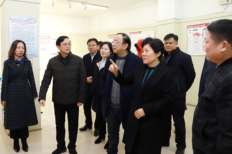 吴桂英一行先后考察了学校视觉传播设计学院、环境艺术设计学院、创新创业教育学院、服装艺术设计学院、完美世界数字文创产业学院,听取了余克泉关于学校办学情况的汇报。吴桂英边走边听,仔细查看,时而驻足询问,对学校的办学成绩和专业特色频频称赞。