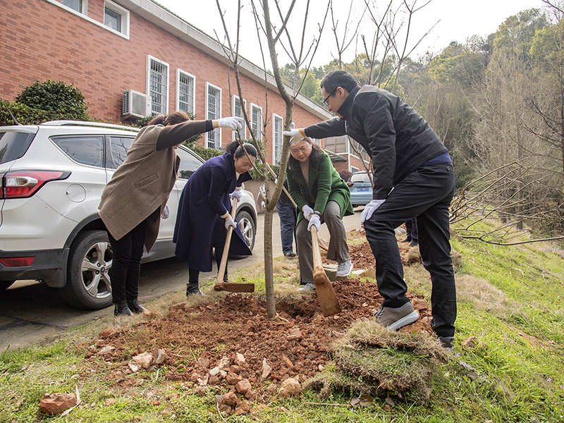 植树现场一片热火朝天的景象,参加植树的领导同志和大家一起挥锹铲土、扶苗培土、提水浇灌,种下一棵棵樱花树、红叶李树。在春天的暖阳下,挺拔的树苗错落有致,让整个校园充满生机与活力。