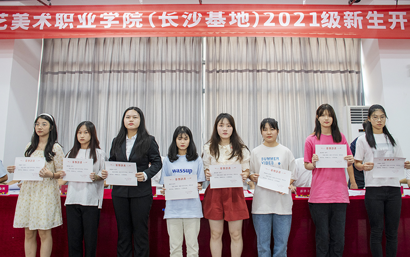 典礼现场,教师代表服装艺术设计学院姚璎璐、手工艺术学院李蕾,老生代表视觉传播设计学院陈碧、手工艺术学院贺佳宁,新生代表环境艺术设计学院刘梦、湘绣艺术学院谢冰赞,帮训单位总教官曹敏依次发言。