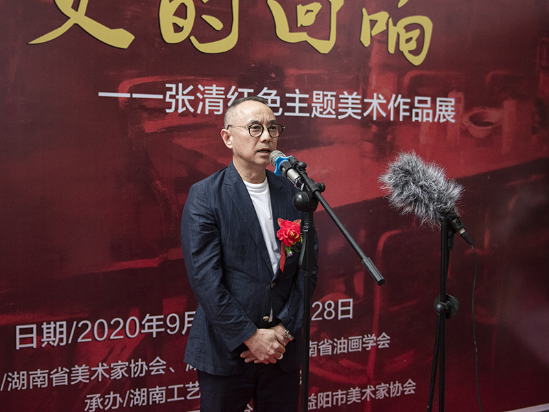 余克泉在开幕式上致辞。他指出,张清老师走遍大江南北,追寻红色革命足迹,专注于红色题材作品创作,创作出了近300幅优秀油画作品,形成了独特的创作风格。余克泉强调,红色文化是中国特色的革命文化、优秀文化,蕴含着丰富的革命精神、优良的革命传统和厚重的历史文化内涵,是中国人民宝贵的精神财富。深化红色记忆,弘扬红色文化,传承红色基因,对于增强文化自信、坚定理想信念,激励人们勇于斗争、勇于战胜困难,为实现中华民族伟大复兴的中国梦而努力奋斗具有十分重要的意义。余克泉指出,本次作品展充分体现了张清作为一名人民教师的责任与担当,不忘立德树人初心,牢记为党育人为国育才使命,努力培养能够担当民族复兴大任的时代新人;充分体现了张清作为一个艺术家以人民为中心的创作导向,讲品位、讲格调、讲责任,用优秀的作品激励人、鼓舞人、影响人。他认为,本次红色主题美术作品展一定能够给观众带来新的审美体验,带来心灵的启迪和精神的滋养。