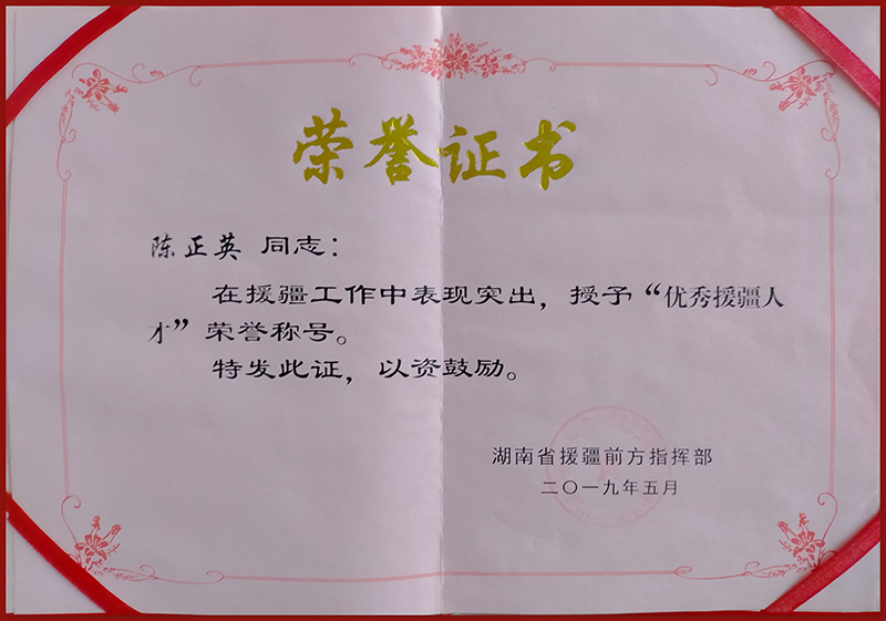 为了让课堂更丰富生动,陈正英在教辅资料和教具上下足了功夫。“从湖南寄过来的包裹里,最多的就是教辅材料。”陈正英说道。她利用家人寄来的服装材料,剪出实际图样,给学生更直观的体验;网购U盘和各色彩纸奖励给学生,并手把手教他们用U盘传输资料;利用休息时间,给学生播放服装表演视频和世界时装周录像,了解行业的前言讯息。一分耕耘一分收获,在陈正英的指导下,从未接触过电脑的学生掌握了电脑CAD制图技术,学生能做连衣裙、裤子和简单的衬衣。2019年6月,湖南省援疆前方指挥部授予陈正英“优秀援疆人才”称号。