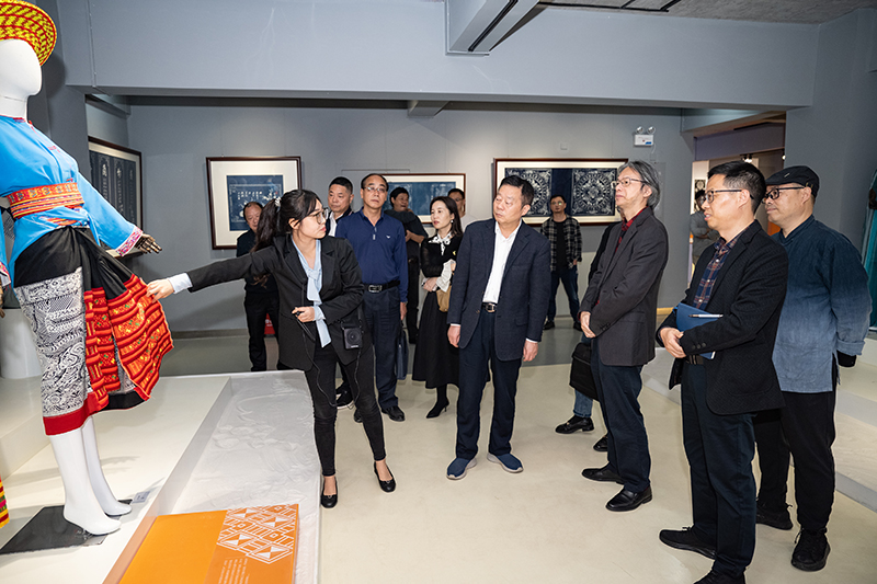 何寄华一行先后参观了学校非物质文化遗产作品展示馆、非遗研培成果展厅、传统工艺美术陈列馆,手工艺术学院、湘绣艺术学院展厅、学生实训室等地。