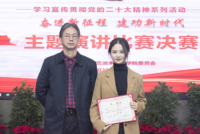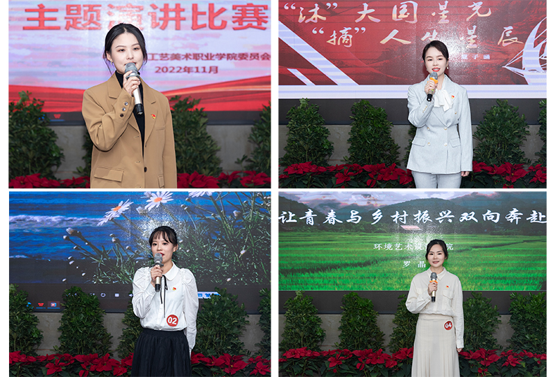 来自数字艺术学院党总支的选手张怡萱以《砥砺奋进跟党走 ,青春献礼二十大》为题,结合党的二十大报告中对广大青年的寄语,表达了作为一名学生辅导员坚守“一切为了学生”的初心,坚定不移践行“请党放心”的铮铮誓言。学生工作部、团委联合党支部的夏子涵为大家悉数列举了新时代中国取得的辉煌成就,深情讲述了张桂梅老师教书育人的感人故事,表达了自己“沐”大国之光,努力奔赴“星辰大海”的坚定信念。环境艺术设计学院党总支的罗晶告诉大家让青春与乡村振兴双向奔赴,青春会因信仰而熠熠生辉、因笃行而任重致远、因梦想而璀璨不凡,号召广大青年朋友踔厉奋发、勇毅前行,在向着第二个百年奋斗目标奋进的新征程上努力创造出无愧于党、无愧于人民、无愧于时代的华彩篇章。来自手工艺术学院党总支的选手杜欢以《一起向未来》为题,讲述了李大钊、方志敏等革命前辈为了国家、民族之未来前赴后继的坚定信仰,黄旭华、黄大年等优秀科学家胸怀大我、至诚报国的使命担当,表达了美院人秉承“致用致美”的校训精神,把握时代脉搏,聆听时代声音,在艺术的道路上不断探索的执着追求。
