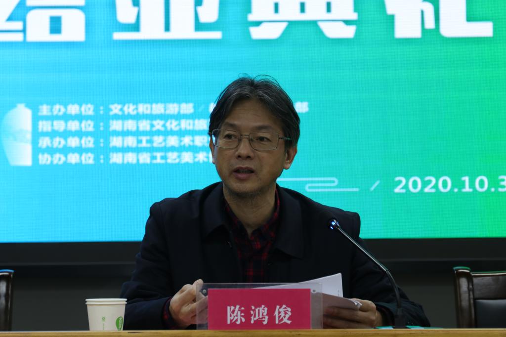 校长陈鸿俊对学员们通过培训取得的成绩给予了充分肯定。他向学员们提出三点希望和要求,一是不忘初心,做非遗传承与创新的坚守者与先行者,即推动非遗在日常生活中、社区居民的需求中振兴,做活态传承的先行者;把现代审美理念与设计融入到陶瓷创作中,做创新传承的先行者;主动适应人民大众追求美好生活的需求,以非遗传统技艺带动就业,改善民生,促进产业发展,做产业发展、带动就业的先行者;坚守地域特色并发扬光大,将非遗传统技艺与文化一代一代的传承下去,做传承技艺的先行者。二是高处着眼,做非遗传承与创新的引领者与先知先觉者,认真研读《关于实施中华优秀传统文化传承发展工程的意见》《中国传统工艺振兴计划》等政策文件,找准定位、主动融入国家发展大局,实现更好的发展。三是交流交友,做非遗文化的优秀传播者与推广者,他勉励学员们结业后广泛交流交友,做讲好中国故事的主力军,为传播优秀传统文化作出自己的贡献。