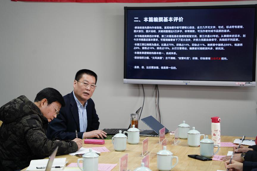 会议伊始,陈鸿俊介绍了参会的嘉宾,并向远道而来的专家表示欢迎和感谢。崔州表示《中国工艺美术全集》定位于中国工艺美术领域的大型历史文献、国家档案、百科全书。他以湖南卷刺绣染织篇为例,就结构逻辑、行文逻辑、学术逻辑、学术规范、信达雅的要求等方面解析了湖南卷审稿工作的细节,并对撰写内容进行了详尽的梳理,这对湖南卷各篇章在接下来的编撰工作中提高效率、确保书稿质量、保证学术规范、符合出版要求起到了有效的促进作用。