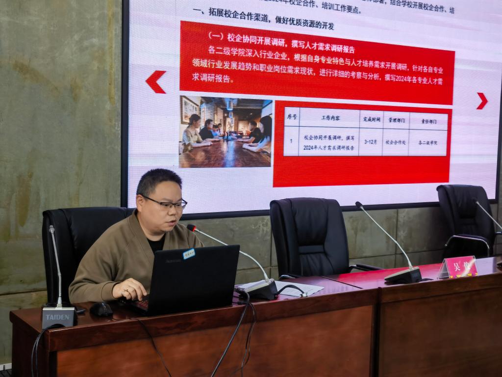 4月11日上午,学校2024年校企合作、培训工作布置会在致美楼206会议室召开。学校校长夏能权出席会议,副校长刘英武主持会议,各二级学院、相关职能部门负责人参加会议。