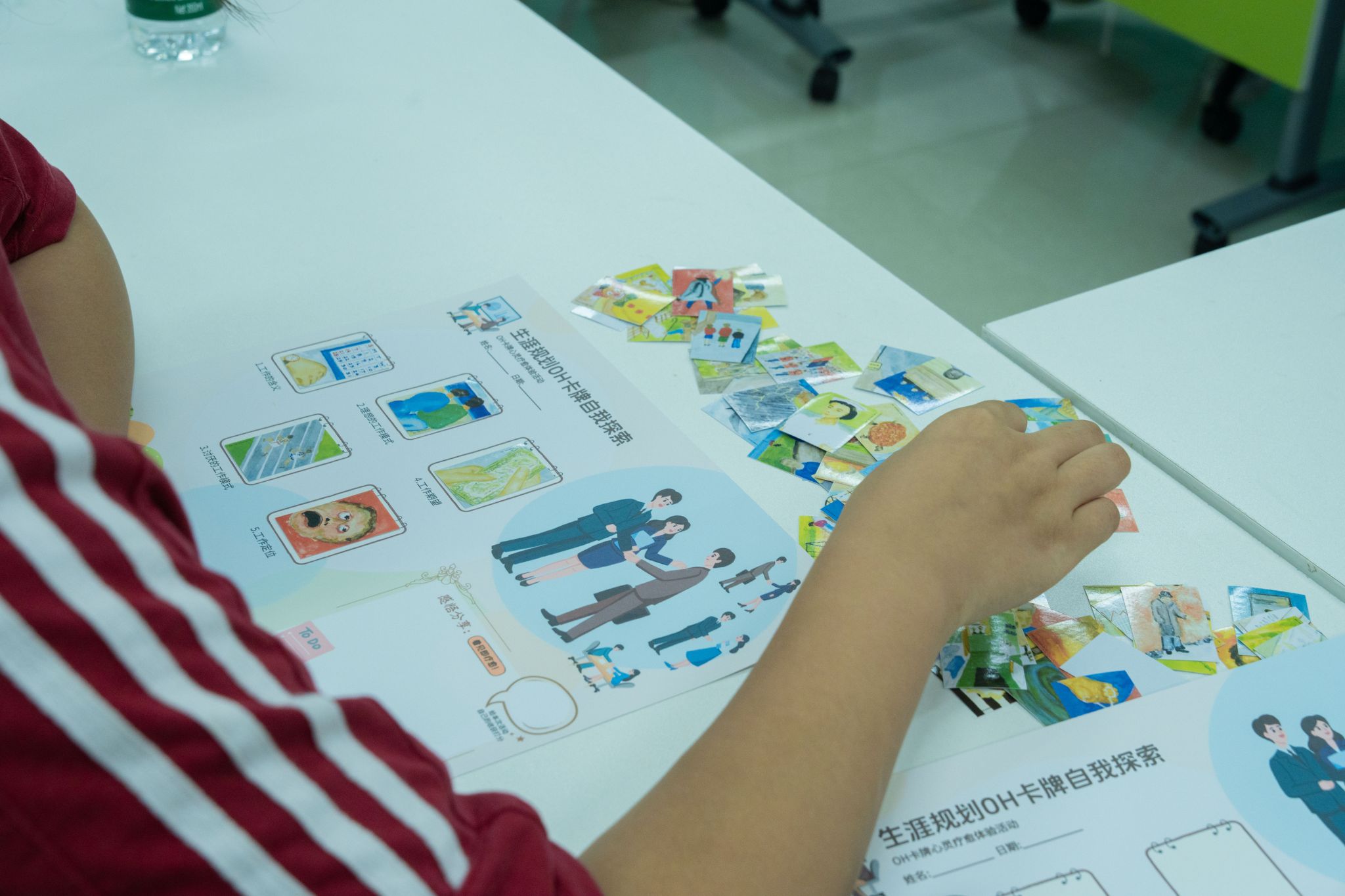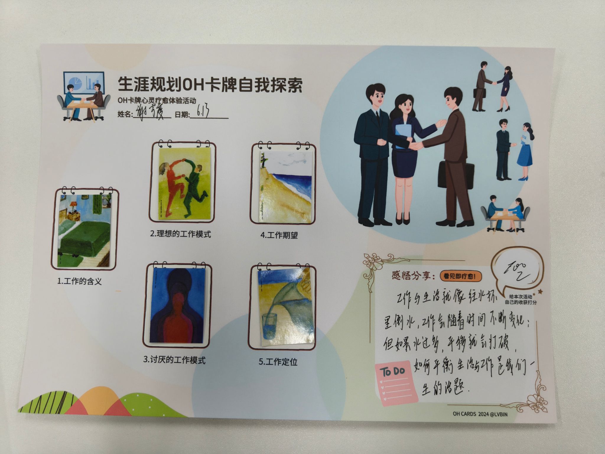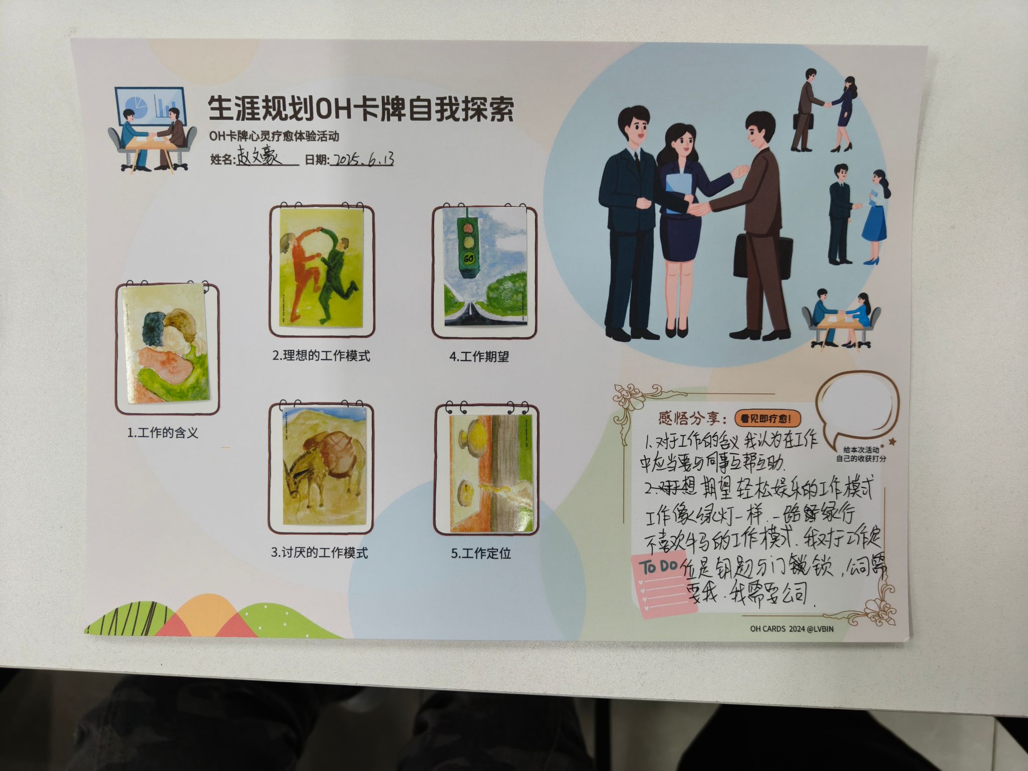 活动突破传统职业指导模式,引入心理学投射工具OH卡。“这些图像就像潜意识的钥匙。”指导老师夏晨在开场时举起卡片解释道,“它们能绕过理性防御,让我们看见内心真实的职业渴望。”参与者通过“卡片盲选—意象解读—画布构建”三阶探索,在“工作的含义”“理想与厌恶的工作模式”“工作期望”“职业定位”五大主题中完成了一场自我认知的深度对话。