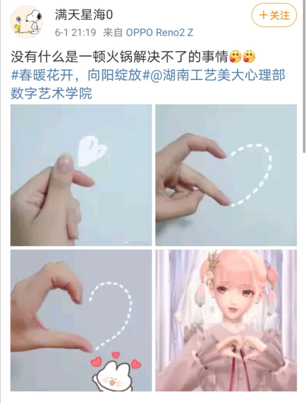 学校心理健康教育与服务中心在易班平台开展“爱自己,要大声说出口”云端启动暨网络表白活动。线下举办“阳光心态 幸福生活 快乐工作”幸福教师心理主题活动,邀请全体教师与学生共度“5.25”,借助向日葵鲜花倡导教师关爱自我的心理健康,同时,寄语广大学生好好爱自己。学校三位心理老师陈燕妮、金晶和彭熠在学校官方抖音平台进行了一场“战疫心晴·一柒一会”有关情绪话题的对谈直播活动,引导学生正确面对成长中的困惑,缓解疫情期间学生情绪困扰。同时各学院心理站创新开展了特色品牌心育活动。视传学院承办“用心战疫 携手前行”故事、海报设计、手绘摄影作品征集活动,号召同学们珍爱生命,增强战胜疫情的信心和决心。数字学院承办“相隔千里心心相印”创意比心活动,为自己比心,发现自身的闪光点。环艺学院承办“温暖集”活动,收集微笑,收集温暖,用微笑温暖生活。服装学院承办“居家抗疫多彩生活”vlog征集活动,鼓励同学们分享多姿多彩的家居生活。湘绣学院承办“抗击疫情 快乐生活”抖音朗读活动,用积极阳光的心态去面对挑战。手工学院承办“匠心手作”原创DIY线上作品征集“疫”卖,发挥专业特长,用“静心、精心、耐心“打磨温暖心灵。全校所有班级还召开了“阳光班级携手前行”心理云班会。