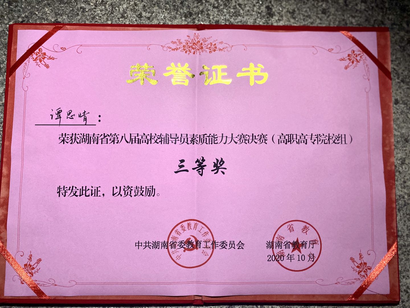 2020年10月25日至26日,湖南省第八届辅导员素质能力大赛决赛在湖南科技大学隆重举行,我校荣获大赛优秀组织奖,辅导员谭思晴荣获高职高专组三等奖。