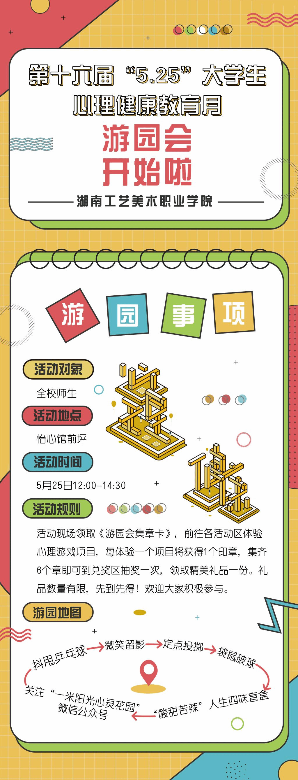 5月25日,学校第十六届5.25心理健康月系列活动启动暨心理游园会在怡心馆成功举办。本届“5.25大学生心理健康教育月”活动以庆祝建党100周年为契机,全面落实立德树人根本任务,秉承发展性心理健康教育和积极心理学理念,聚焦“百年奋进美育红心”主题,依托“学校-学院班级”三级心理健康教育网络和二级学院特色成长辅导室、“一米阳光心灵花园”微信公众平台、长沙基地微信公众平台、易班等平台,组织开展一系列内容丰富、形式多样、互动性强的心理健康教育活动,营造积极健康向上的校园氛围,培育学生自尊自信、理性平和、积极向上的健康心态,促进学生全面协调发展。