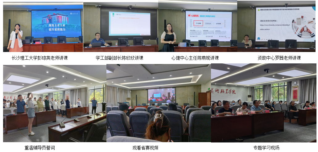 在专题学习环节,学校特邀长沙理工大学辅导员彭琼英做了《聚焦主责主业提升素质能力》专题讲座,彭琼英结合自身工作及参赛经历,指导辅导员如何锤炼政治素养、聚力三全育人、提升自身素质能力,做一名政治素养过硬、育人目标明确、业务能力扎实的新时代高校辅导员。学生工作部副部长陈欣欣做了《怎样当好一名辅导员》专题讲座,他带领全员重温辅导员誓词,从辅导员队伍专业化职业化的政策依据、角色定位、发展路径三方面指引辅导员不忘初心、牢记使命,不断提升职业能力,努力实现职业理想。心理健康教育与素质发展中心主任陈燕妮做了《大学生心理危机识别与处理》专题讲座,她从上级有关心理文件精神的解读入手,结合经典生动案例,从心理危机的含义,心理危机的干预举措三个方面展开,依次讲授了3种个体危机(发展性危机,境遇性危机和存在性危机)识别、预警、干预的方法,为辅导员做好大学生心理危机识别与干预提供了系统而专业的指导,对于辅导员后续更好地开展心理健康教育工作提供了有力支持。学生资助中心罗茜老师做了《资助政策宣讲》专题讲座,重点宣讲了国家奖学金、国家励志奖学金、国家助学金以及服兵役高等学校学生国家教育资助政策,对资助工作中的常见问题进行了详细解答。学工部组织全员观看了湖南省第九届辅导员素质能力大赛视频,重点对案例研讨和谈心谈话两项赛事进行了学习与研讨,通过学习和交流,辅导员更深入地了解了比赛规则和技巧,进一步认识到大赛与日常工作间密不可分的关系。