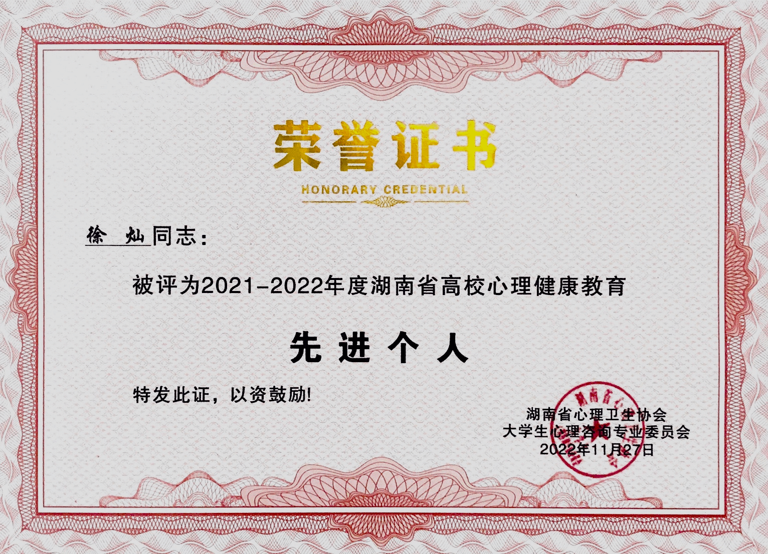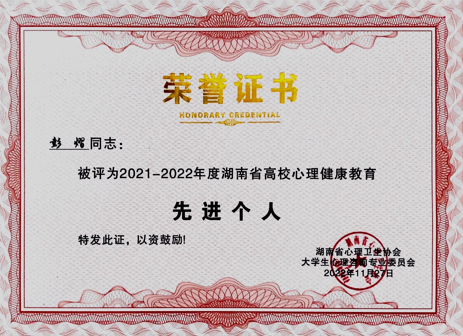 11月26-27日,湖南省心理卫生协会大学生心理咨询专业委员会第十七届年会在线上召开。会上,湖南省心理卫生协会大学生心理咨询专业委员会对2021-2022年度的先进单位、先进个人、优秀心理类学生社团进行了表彰。我校荣获2021-2022年度湖南省高校心理健康教育“先进单位”,专职教师彭熠、徐灿荣获2021-2022年度湖南省高校心理健康教育“先进个人”。