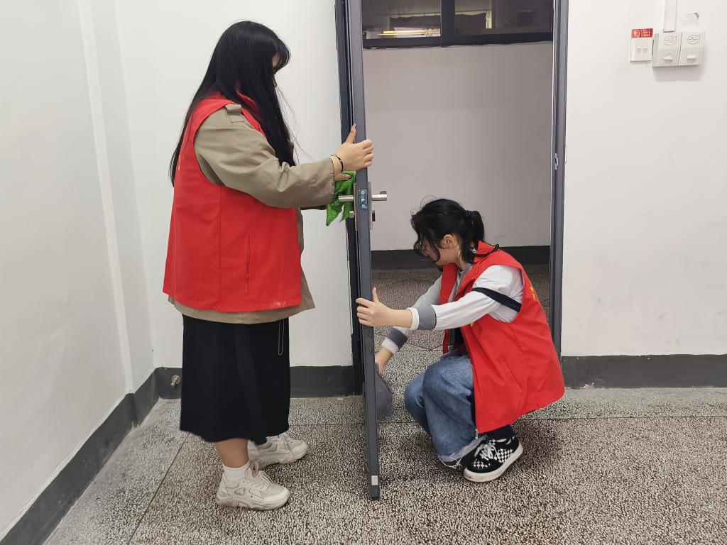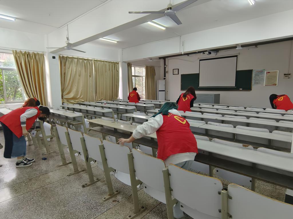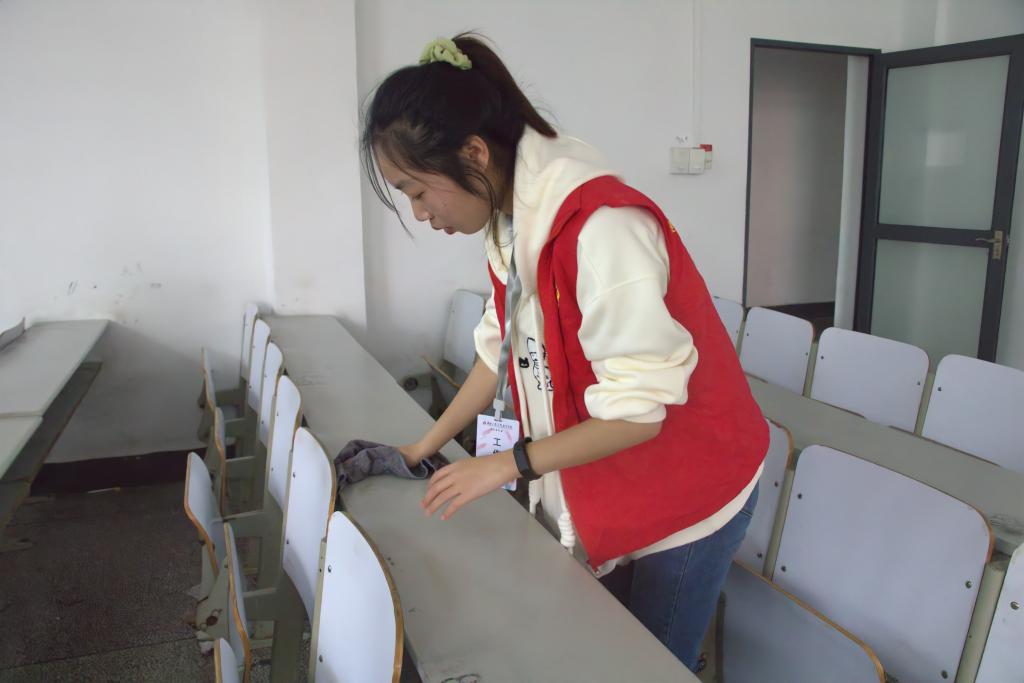 为了给学校师生创造更加舒适的上课环境,学生会全体成员都积极主动的参与了此次活动。他们身穿红色马甲,手拿扫把、拖把、抹布、清洗剂等清洁工具,穿梭在教学楼的各个位置,在充满艺术气息的教学楼里点缀出灼灼红心。他们用抹布擦去窗户、桌子上的污渍,用扫把扫去地上的灰尘,不放过任何一处死角,不留下任何一处灰尘,使教室更加亮堂,使环境更加整洁,使师生心情更加愉悦。阳光掠过窗外的树叶,透过玻璃洒落在志愿者的身上。阳光照亮的不仅仅是每位志愿者,照耀的更是每一位在生活中不断传承和发扬雷锋精神的美院人。