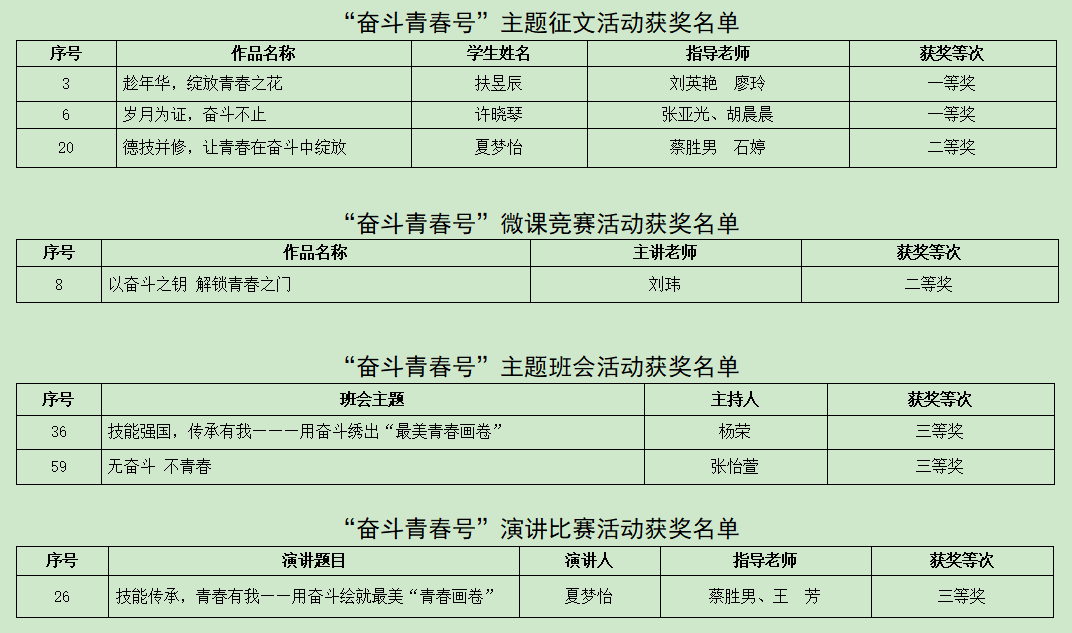 在主题征文活动中,学生扶昱辰、许晓琴均获得一等奖,夏梦怡获得二等奖。在微课竞赛中,思政课教师刘玮获二等奖。在主题班会活动中辅导员杨荣、张怡萱均获得三等奖。在主题演讲比赛活动中,学生夏梦怡获得三等奖。