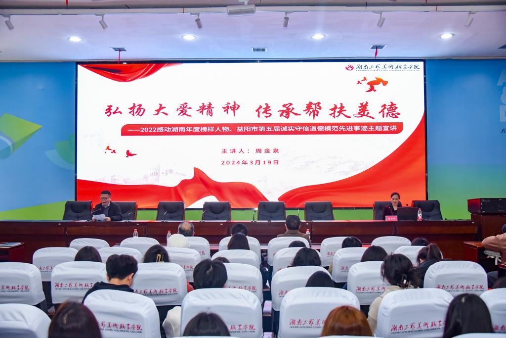 为构建学校崇德尚善、学生诚实守信的良好氛围,通过身边人讲身边事、身边人说自己事、身边事教身边人,不断提高学生思想道德修养和文明素质、自觉成为文明道德的传播者和践行者,学校学生资助管理中心特邀请“2022感动中国之感动湖南年度榜样人物”、益阳市第五届诚实守信道德模范周金泉做“弘扬大爱精神 传承帮扶美德”主题宣讲。益阳市委宣传部副部长陈洁云、市政协委员学习联络委员会副主任李保、学校学生工作部(处)部(处)长陈立新出席报告会,报告会由学生工作部(处)副部(处)长陈欣欣主持。