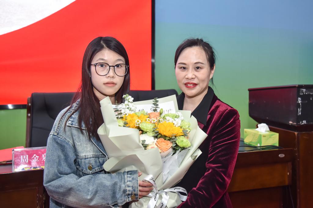 学生代表为道德模范周金泉献上鲜花