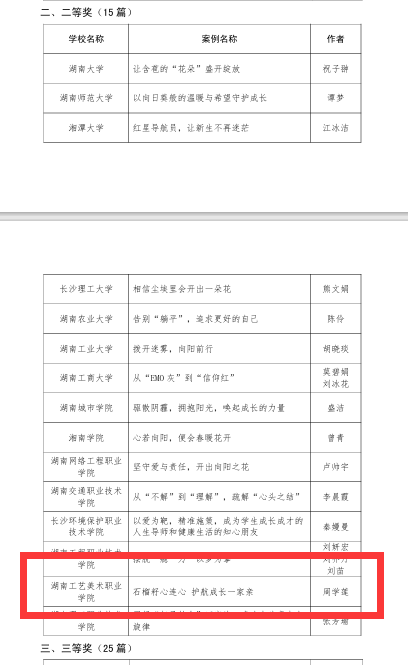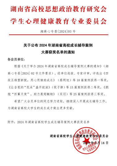 为备战此次大赛,学校心理健康教育与素质发展中心组织开展了校级成长辅导案例大赛,经学院推荐、学生工作部心理健康教育与素质发展中心初审、校内专家复审,最终评选出优秀辅导案例一等奖1名、二等奖2名、三等奖3名。排名前二的作品由学校推荐至湖南省高校大学生心理健康教育研究会参加省级比赛。