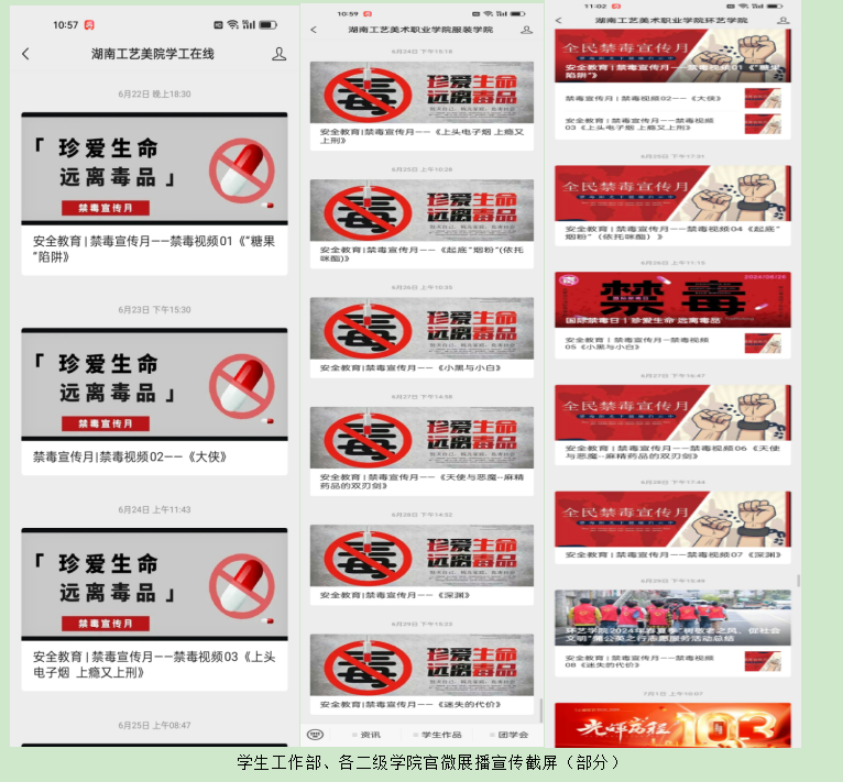 本次活动主要通过各楼栋电子主屏、学工部微信公众号、各二级学院微信公众号等平台进行展播宣传。内容来自国家禁毒委评选出的“2024年6月全民禁毒宣传月短视频征集活动”获奖优秀作品。通过这次展播宣传活动,促使学生对麻精药品的种类及其滥用带来的危害有了更深入的了解,识毒防毒拒毒的能力有了进一步的提升,为学生无毒青春、健康生活进行了有力守护。