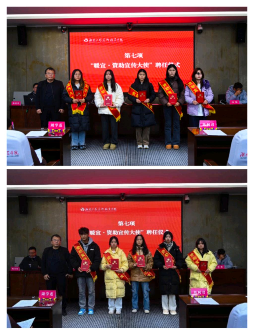 送一批“资助宣传大使”,榜样伴你前行。学校邀请了一批优秀学子,用自己的实际行动和亲身经历,向更多的人宣传资助育人的理念,传递正能量。彭泽立为为资助宣传大使颁发证书、佩戴绶带。