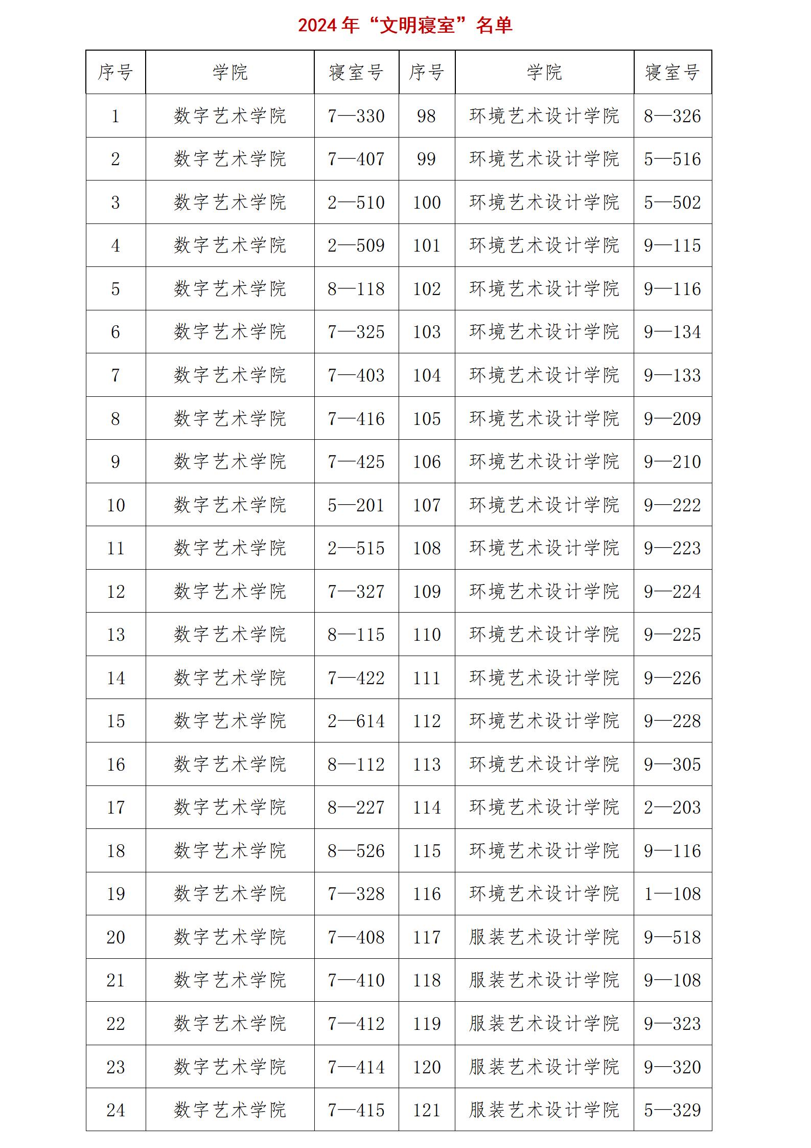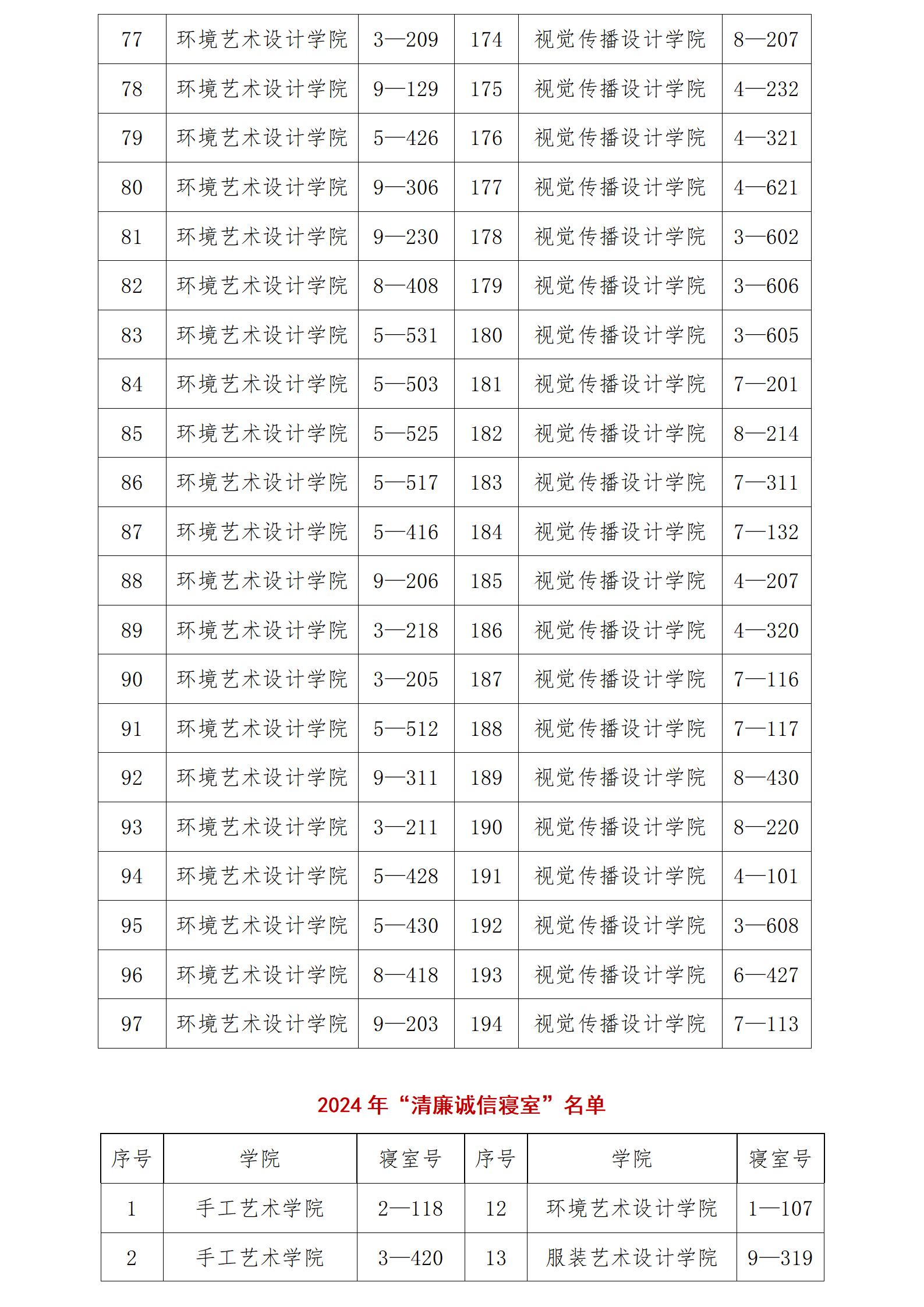 2024年学校第三届宿舍文化艺术节之“创建特色寝室,彰显青春风采”评选活动开展以来,经各二级学院广泛发动、学生积极创建、二级学院推荐、学校审核,评定9栋518等194间宿舍为“文明寝室”,9栋307等21间寝室评为“清廉诚信寝室”,7栋330等59间寝室评为“学习型寝室”,具体情况如下:
