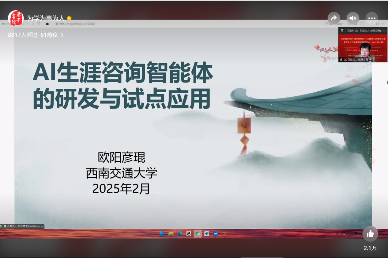 西南交通大学人文学院教师欧阳彦琨博士聚焦于“AI生涯咨询智能体研发与试点应用”,结合心理学与生涯教育的专业背景,探讨了AI技术在学生生涯规划中的实际应用。