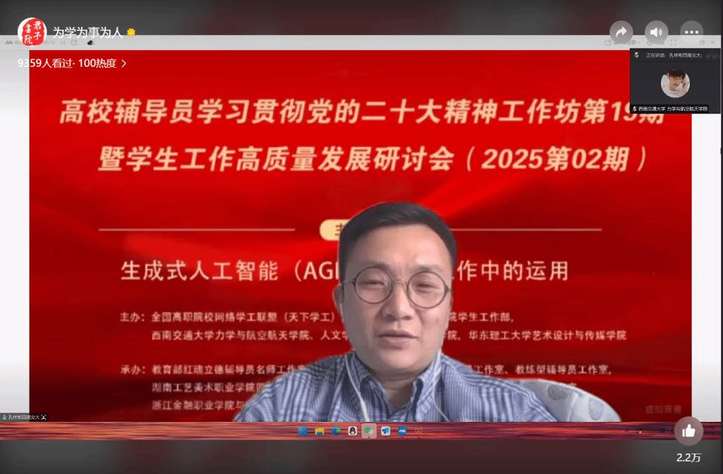 本期沙龙以“生成式人工智能(AGI)在学生工作中的运用”为主题,旨在探索新时代学生工作高质量发展的新路径。会议邀请了LangGPT创始人云中江树和重庆大学、西南交通大学、杭州电子科技大学、山东商务职业学院、武汉职业技术大学、江西冶金职业技术学院、浙江金融职业学院等高校的7位嘉宾做报告,吸引了全国近600所高校、4.2万余人次观看。