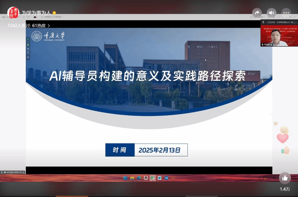 重庆大学党委学生工作部副部长郑恒毅以“AI辅导员构建的意义及实践路径”为题,从建设背景、建设过程、工作进展与成效、存在问题与规划等四个部分,详细阐述了重庆大学AI辅导员的构建意义与实施策略。