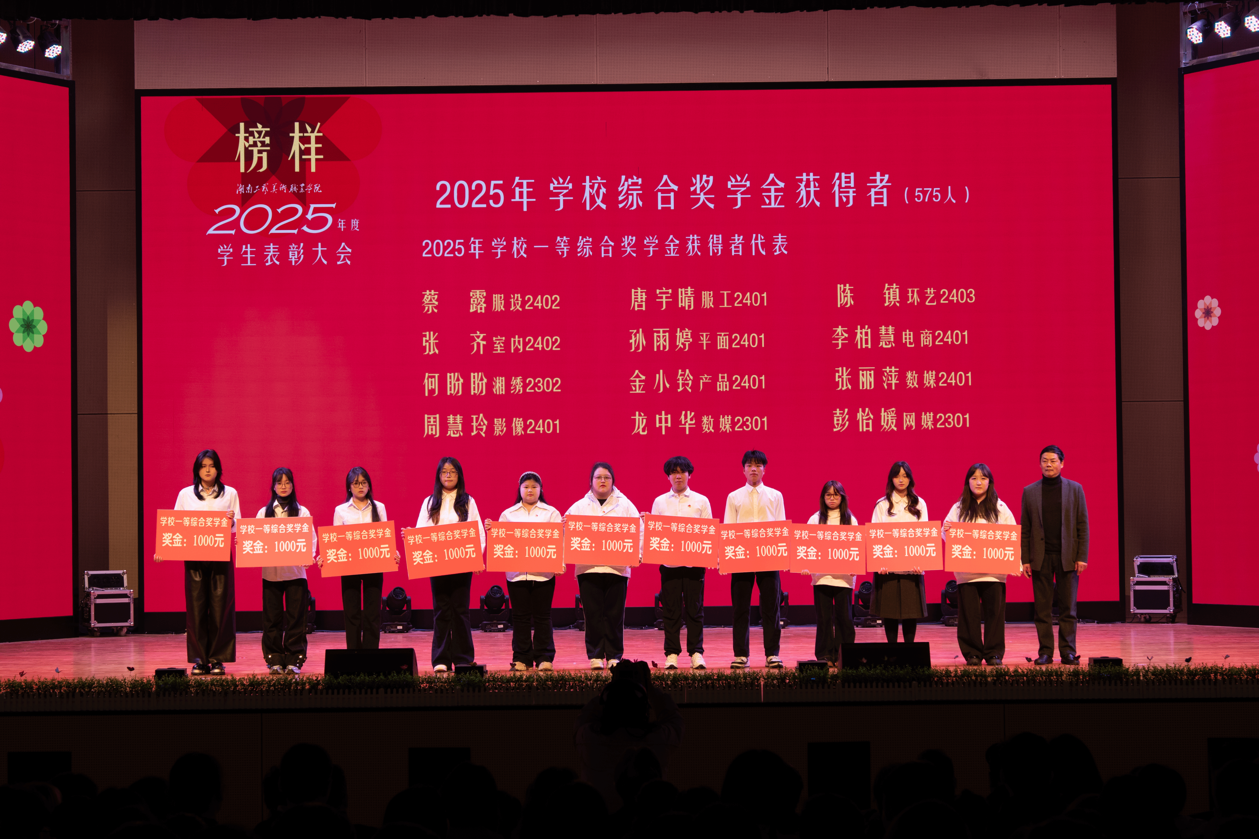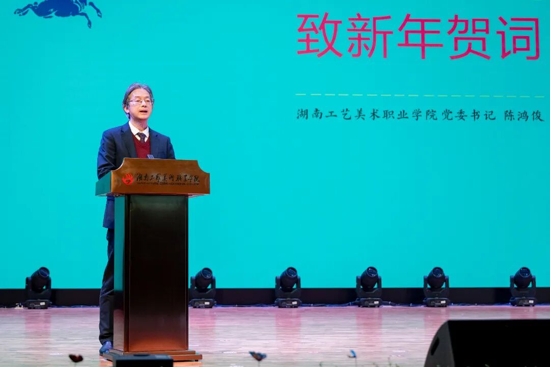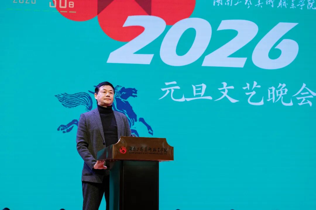 晚会由学校党委副书记汪泳波主持开场。随后,在庄严肃穆的国歌声中,大会正式拉开序幕。陈鸿俊发表了热情洋溢的新年贺词。陈鸿俊首先代表学校党委,向全体师生员工、离退休老同志、校友及各界朋友致以最诚挚的问候和最美好的新年祝福。他深情回顾了不平凡的2025年。这一年,是新中国成立76周年,是学校建校50周年的荣耀之年,更是全体美院人凝心聚力、实干担当,推动各项事业实现新跨越的一年。他用五个“这一年”,概括了学校取得的丰硕成果:高举旗帜、铸魂育人,党建引领与思政工作开创新局面,获评湖南省“三全育人”综合改革考核“优秀”,1个项目入选教育部思政工作精品项目、获得省级“双带头人”工作室、样板支部等5项荣誉、思政课教师在国家级教学展示中斩获二等奖;聚力攻坚、跨越发展,学校重大战略实现里程碑式突破,刺绣设计与工艺专业群成功立项国家“双高计划”,职业本科大学筹建顺利推进,并荣获第九届黄炎培职业教育奖优秀学校奖,建校50周年校庆系列活动圆满成功;深耕内涵、提质培优,教育教学与师资建设成果丰硕,5个微专业入选教育部“双千计划”、1门课程获评全国课程思政典型案例、10余人获“湖南省技能大师”“青年骨干教师”等省级人才称号、1个教师团队认定“全国高校黄大年式教师团队”,全年教师获省级以上奖项171项;扎根大地、服务社会,产教融合与非遗传承彰显新作为,牵头成立全国性行业产教融合共同体,完成安化“百村”标志设计等重点项目,开发湘绣、湘瓷等创新作品304件套,编纂出版《湖南传统工艺蓝皮书(2025)》,非遗传承创新成果显著,湖湘工艺美术展成功走入澳门;以人为本、立德树人,治理效能与校园生态持续向好,“一站式”学生社区与“工小美”AI伴学助手上线运行,立项教育部“教育强国三年行动计划”立德树人机制综合改革试点院系1个,获评湖南省高校心理健康教育先进单位、学生工作先进单位、资助工作先进单位,全年学生获省级以上奖项275项;平安校园、清廉校园建设扎实推进。