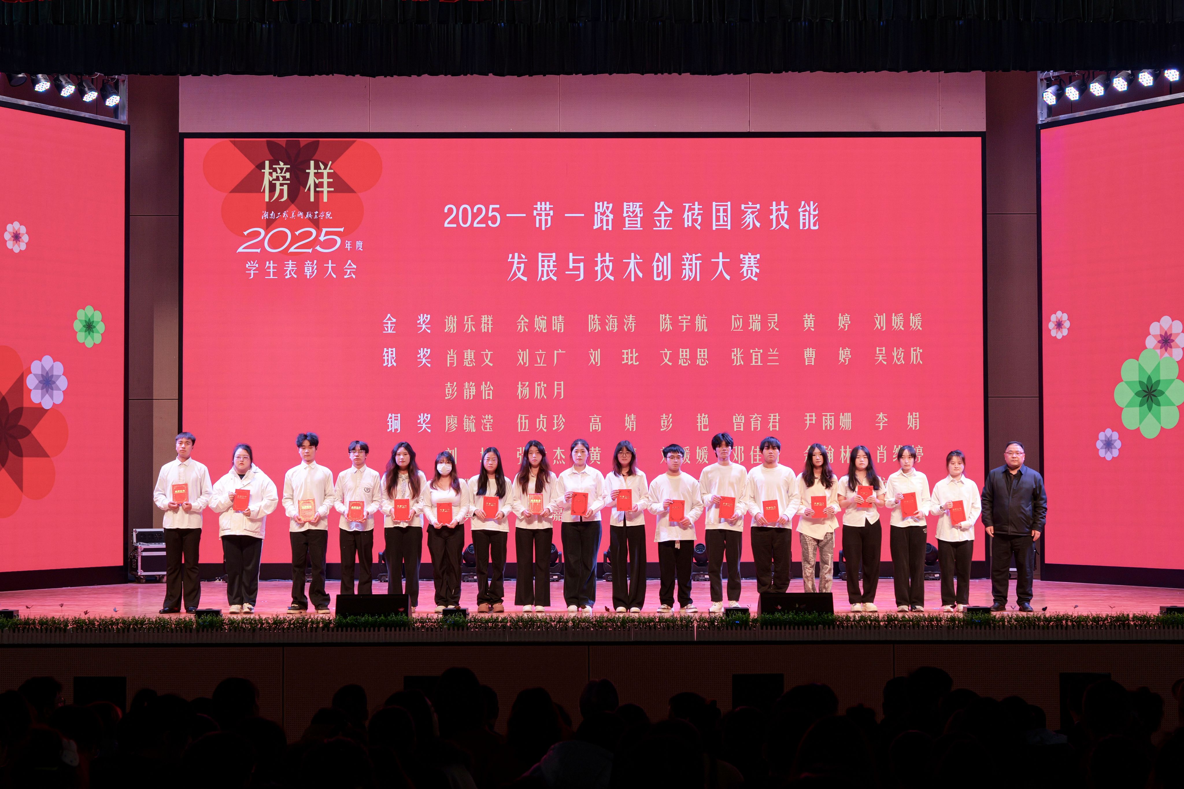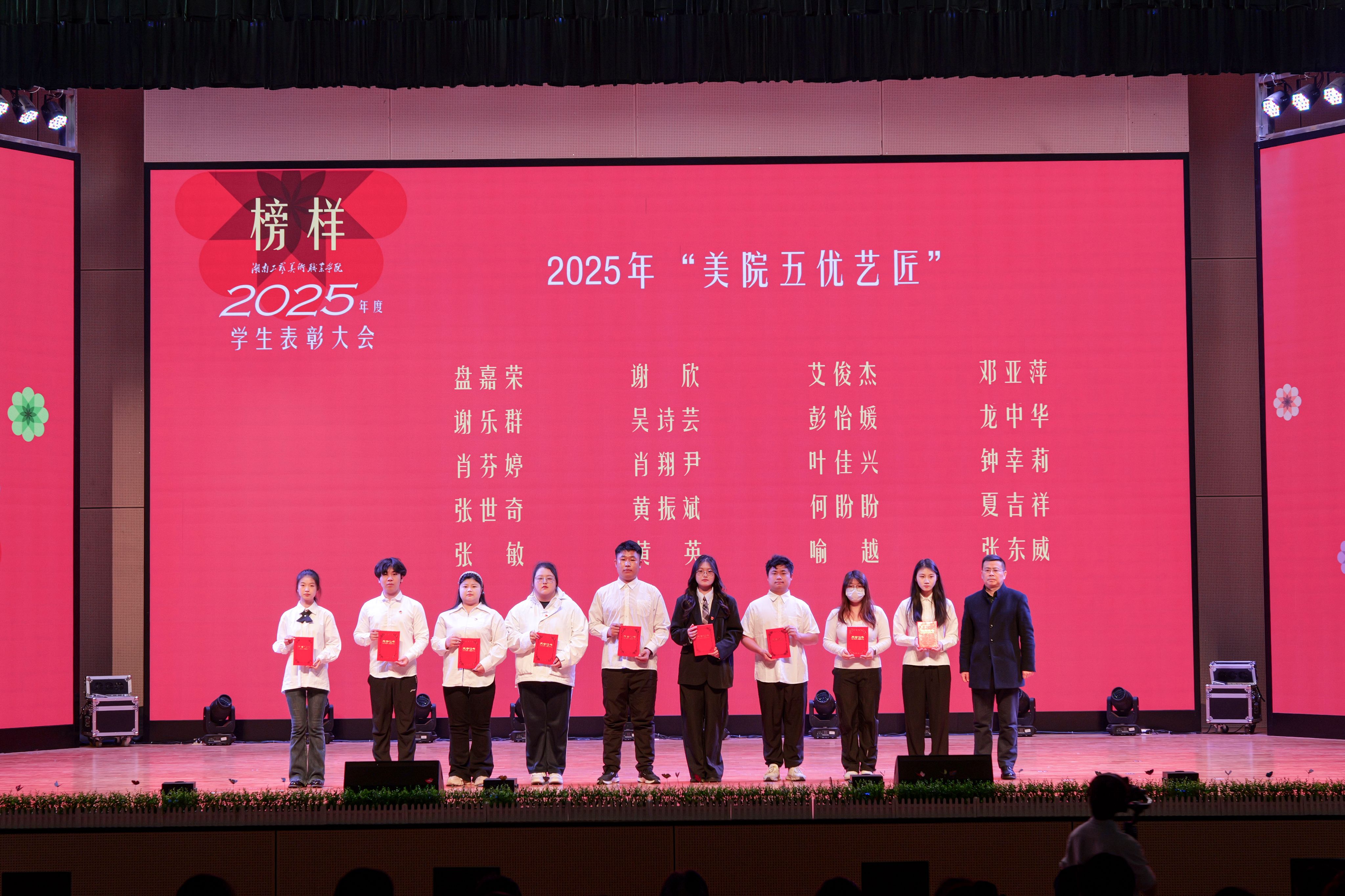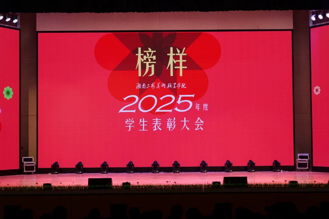 在过去的一年中,美院学子在创新创业的浪潮中敢为人先,在技能竞赛的舞台上为国争光,斩获国家级、省级奖项共计300余项。晚会现场还对2025年度学校创新创业奖学金获得者、国家级技能竞赛获奖者及优秀班集体进行了集中表彰。台上熠熠生辉的奖牌,台下雷鸣般不息的热烈掌声,共同构成了对奋斗青春的最高礼赞。