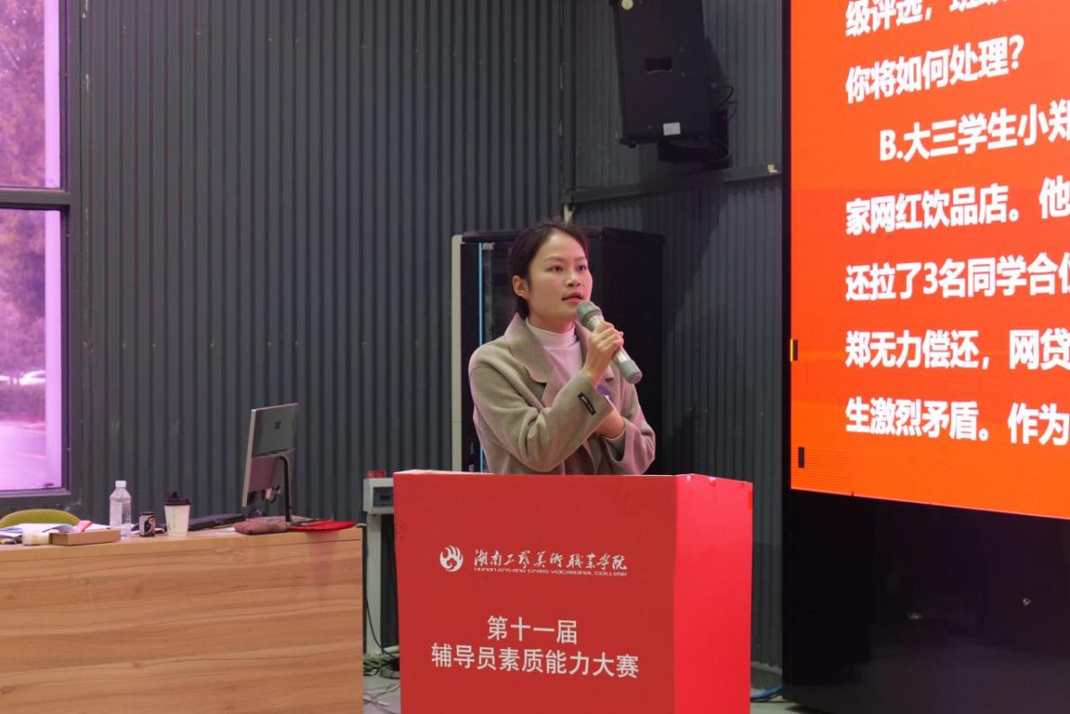 在“谈心谈话”环节,选手现场抽题,与模拟学生进行情景再现式谈话。面对学生提出的学业困惑、人际矛盾、心理困扰、职业迷茫等问题,选手们耐心倾听、循循善诱,展现了良好的沟通艺术和教育智慧。长沙职业技术学院学生工作部部长李寒佳、湖南城市学院学生工作部副部长王雄鹰、益阳职业技术学院工会副主席皮惠林、学校湘绣艺术学院党总支副书记蔡胜男、学校学生工作部副部长陈欣欣等5位评委现场打分,成绩当场公布。