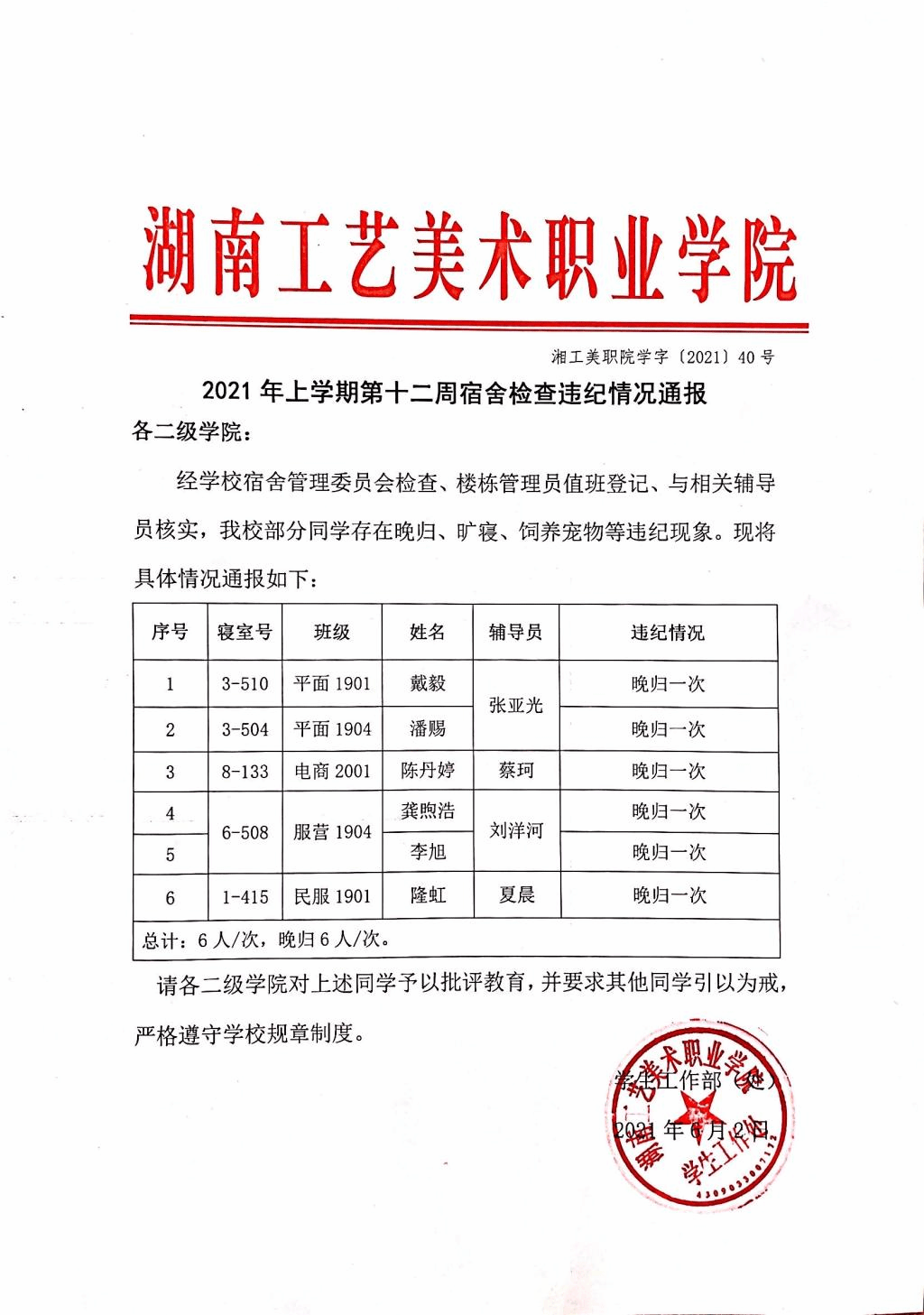 2021年上学期第十二周宿舍检查违纪情况通报