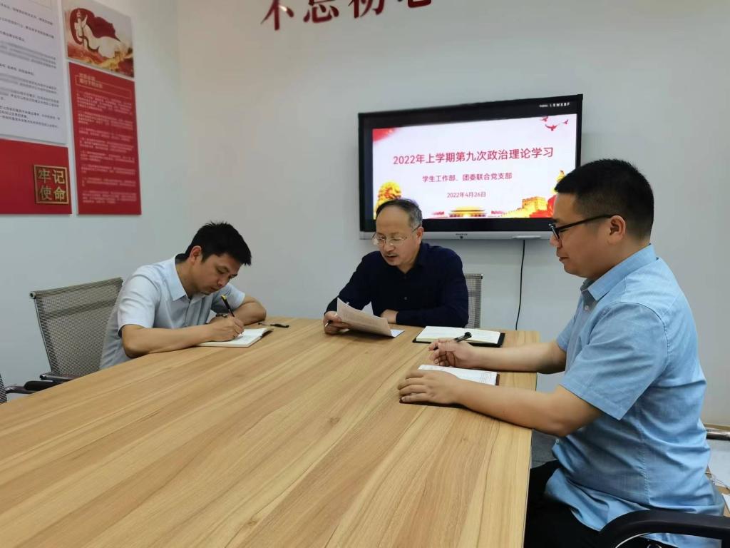 4月26日下午,学生工作部、团委联合党支部在支部会议室组织开展了2022年上学期第九次理论学习。部门全体成员参加。会议由支部书记陈立新主持。