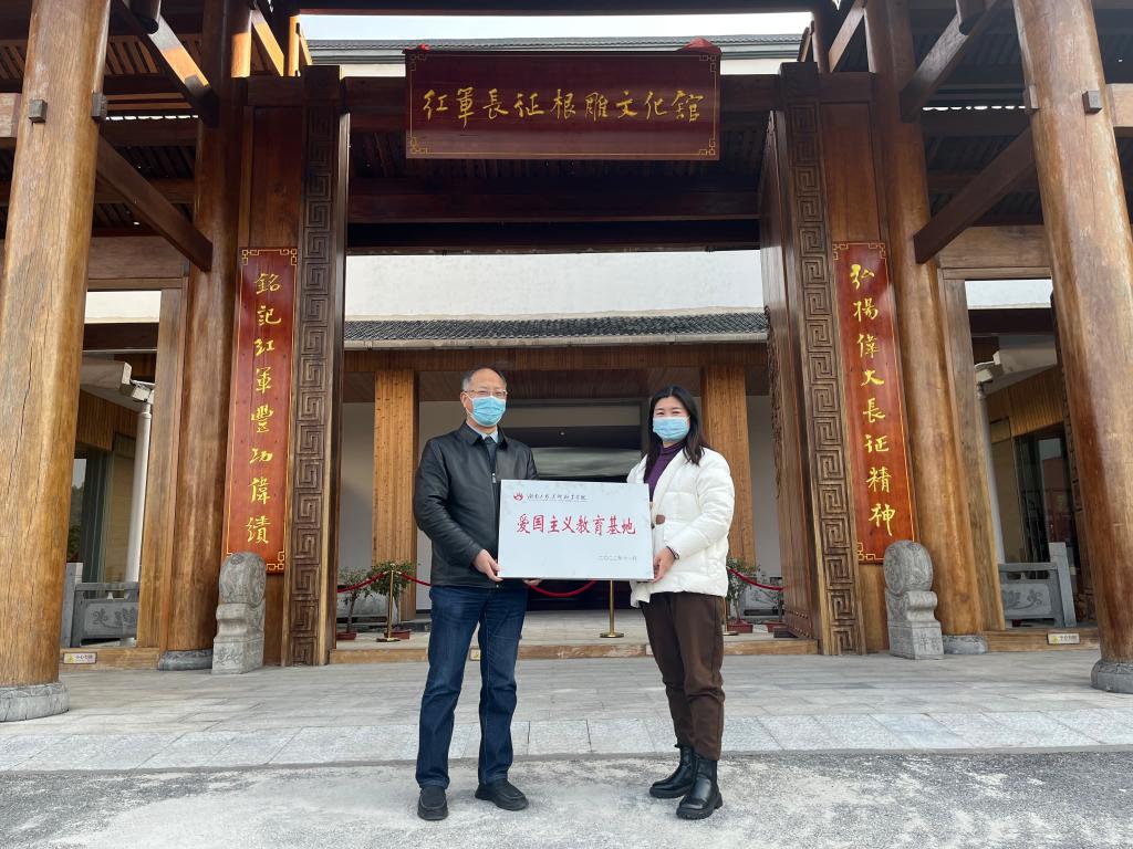 参观结束后,学校和益阳天意木国举行了校地共建“爱国主义教育基地”揭牌仪式。陈立新和天意木国馆长陈立雄一同为”爱国主义教育基地”揭牌。