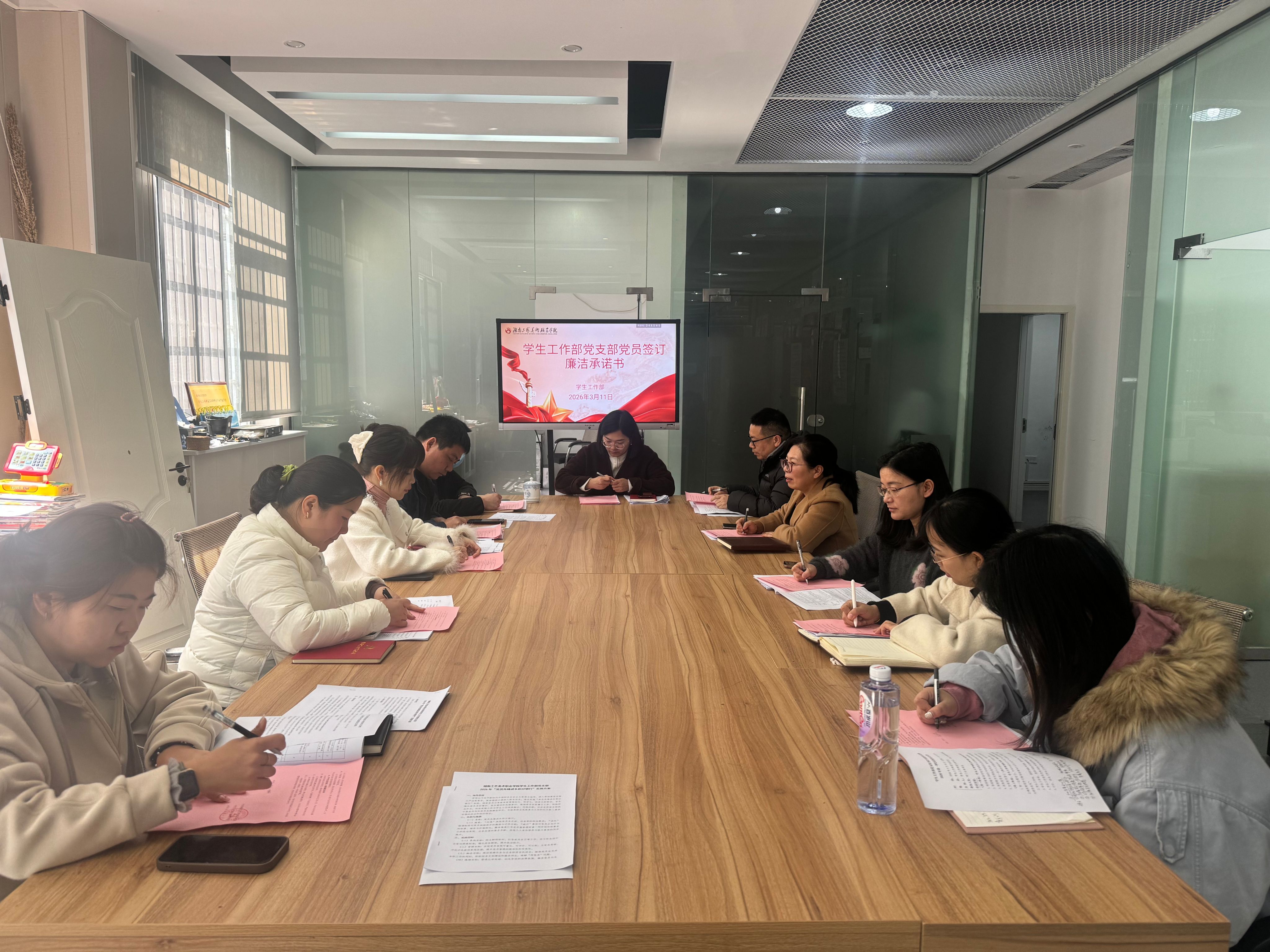 会议第二阶段召开2026年第一季度支部党员大会。全体党员开展“第一议题”学习,深入学习中共中央办公厅《关于在全党开展树立和践行正确政绩观学习教育的通知》及习近平总书记关于“让愿担当、敢担当、善担当蔚然成风”的重要论述,进一步凝聚思想共识、强化责任担当。会议对学生工作部党支部2026年思政工作、宣传统战工作、意识形态工作进行全面部署,明确年度工作重点和落实要求;对2026年清廉考核工作作出具体安排,聚焦学生管理、奖助贷等廉政风险点,压实廉洁工作责任;同时部署支部2026年基层党建工作,细化党建工作任务,推动党建与学生工作深度融合。