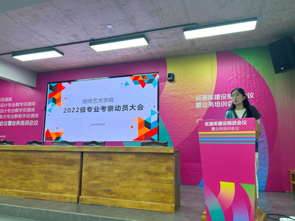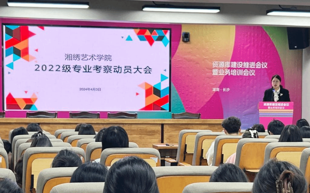 2024年4月3日,湘绣艺术学院在综合办3楼会议室召开了2022级学生专业考察动员大会。湘绣艺术学院党总支副书记蔡胜男、2022级辅导员杨晴老师,专业考察带队教师赵蓓瑛、李利华、吴晶慧、贺熙华老师,以及2022级全体学生参加了会议。