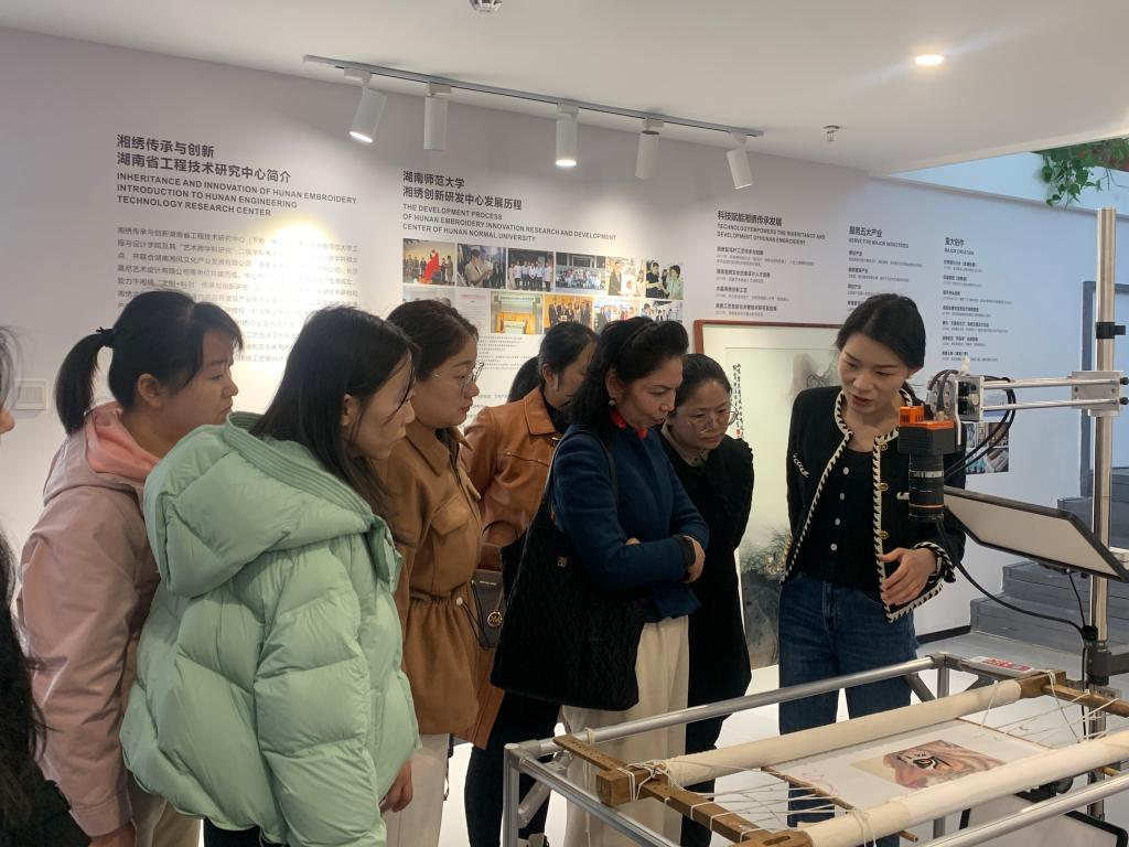 校企双方随后围绕“湘绣数字化”展开深度对话。湘绣艺术学院党总支书记唐利群详细介绍了学校在保护传承传统湘绣技艺的基础上,在非遗数字化保护、数字化刺绣人才培养等“非遗+科技”方面的工作开展情况。湘风文化产业发展有限公司董事长孙舜尧表示,双方可进一步加强合作,共建“湘绣数字资源库”,开发更多湘绣数字文创产品,打造湘绣IP,真正实现湘绣数字化转型,让非遗湘绣更加符合现代社会发展,将湘绣以多种形式传承下去。