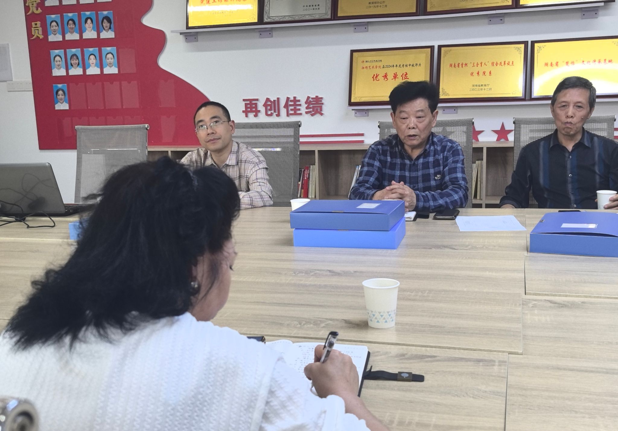 首先,谢文波向督导组详细汇报了学院本学期教学运行情况。随后,督导组对《湘绣简史》《平色构成》《图案设计》《专业考察》等课程结课材料、教研室活动记录及教学例会档案进行全面检查,重点核查了教案设计、作业讲评、成绩评定等材料,并与教师代表就教学实施细节展开交流。
