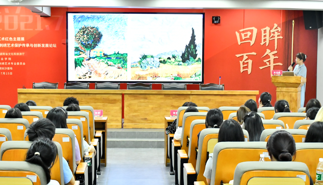 国家级非物质文化遗产项目湘绣代表性传承人、亚太地区手工艺大师、中国工艺美术大师、湘绣艺术学院工艺总监刘爱云大师,湘绣艺术学院党总支书记、院长唐利群,刺绣工艺教学部主任赵蓓瑛、学工办主任杨荣、专任教师肖念、留校教师刘艳冰、吴晶慧、李利华、贺熙华参加了此次专业教育讲座。副院长吴俊主持本次专业教育讲座。