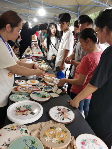 学生创意作品售卖活动现场更是热火朝天,学生设计制作的湘绣创意绣品既实用又美观,有刺绣团扇、发夹、发簪、丝巾、包包、首饰等,种类繁多,工艺精美。一件件创意新颖、独一无二的作品让大家争先购买,有些甚至买了好几件。一位妈妈说到,“这些手工制作的发簪我真是太喜欢了,我有两个女儿,一人要买一个。这些小姑娘的手真是太巧了!”