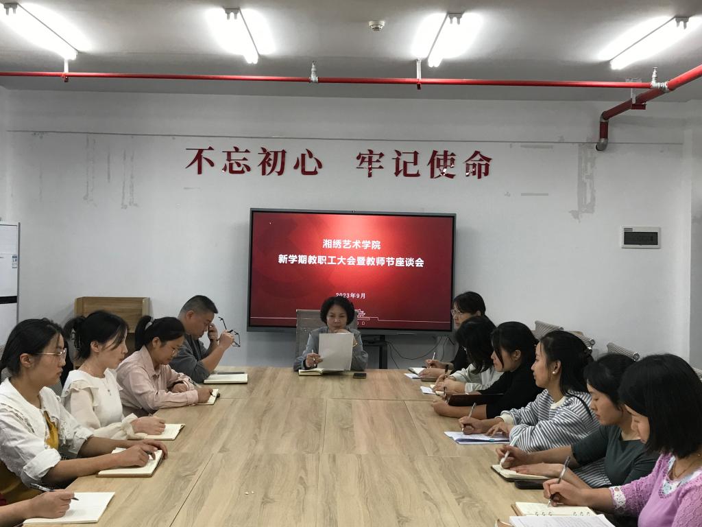 9月9日上午,湘绣艺术学院在301会议室召开新学期教职工大会暨教师节座谈会。学院党总支书记、院长唐利群,副书记蔡胜男,副院长吴俊及全体教职工参加会议,会议由唐利群主持。