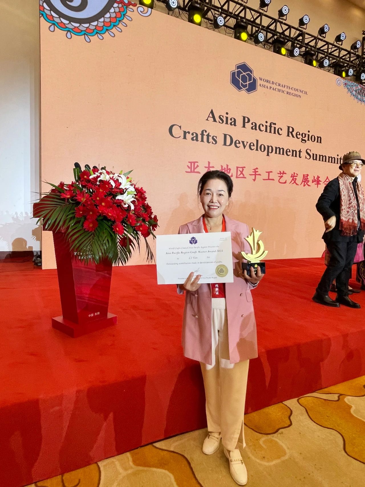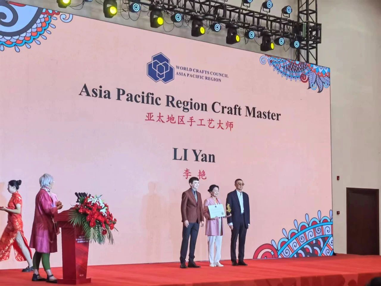 2023年11月8日,亚太地区手工艺发展峰会、世界手工艺理事会亚太地区手工艺大师称号授予仪式在东阳市举行。我校“湘绣传承与创新黄大年式教师团队”骨干成员、“双高专业群”刺绣设计与工艺专业群企业带头人、中国工艺美术学会刺绣艺术专业委员会主任、中国工艺美术大师、中国非物质文化遗产湘绣代表性传承人——李艳大师获得第四届“亚太地区手工艺大师”荣誉称号,这一荣誉的授予,是对李艳大师在其手工艺领域的卓越成就与贡献的高度认可,“湘绣传承与创新黄大年式教师团队”骨干成员已有2名“亚太地区手工艺大师”。