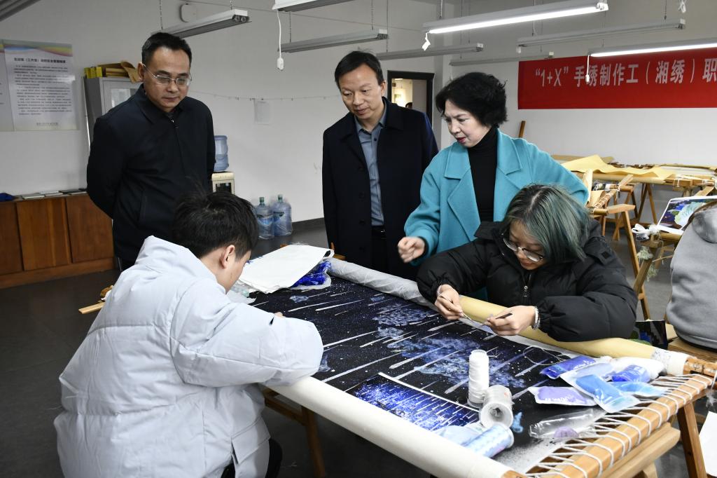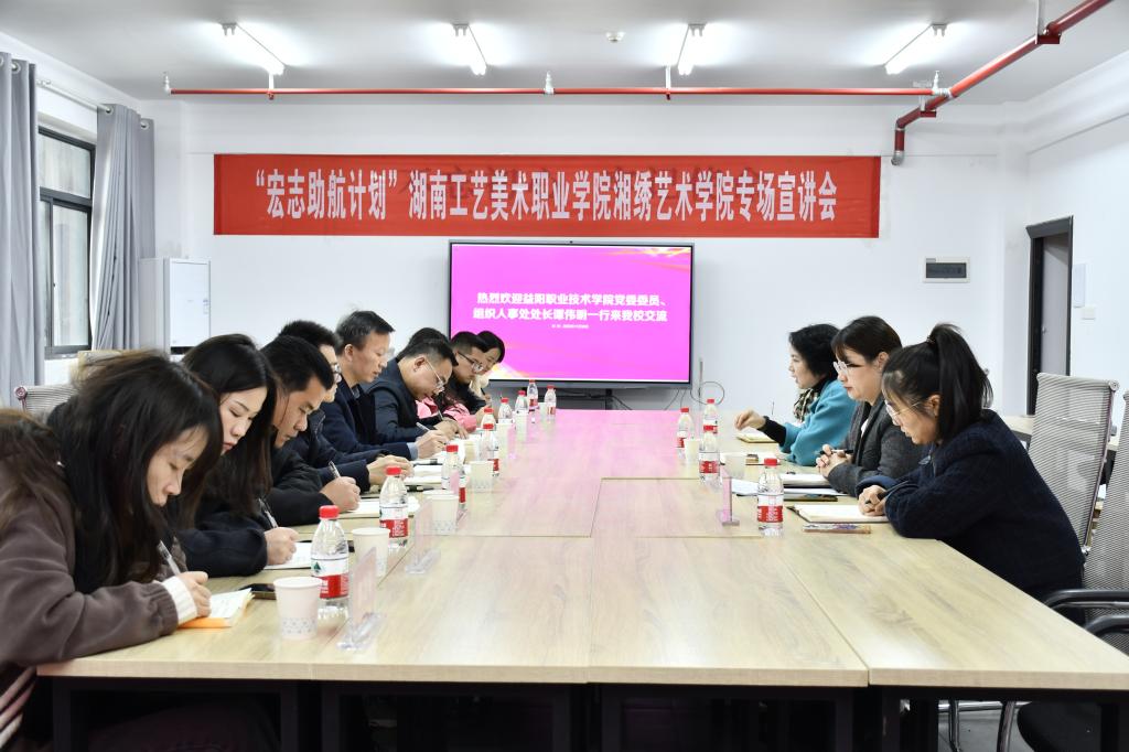 谭伟明一行首先参观了学院刺绣与设计专业教师党支部书记工作室、展厅及实训室等。接着,双方在301会议室开展座谈,并就党组织对标争先、全国党建工作样板支部培育创建、湖南省“三全育人”试点院系创建等进行了经验交流与分享。