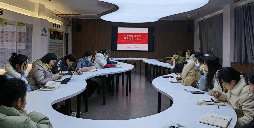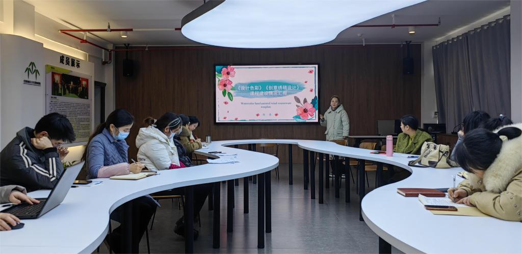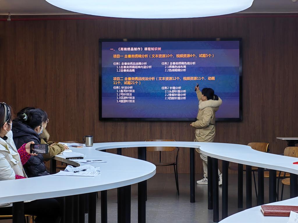 本次课程建设情况汇报会共有《设计素描》、《设计色彩》、《图案设计》《湘绣技法基础》、《绣稿设计(绘画)》、《创意绣稿设计》、《湘绣技法》《简易绣品制作》、《中端绣品制作》、《高端绣品制作》、《数字化刺绣》、《湘绣产品开发》12门课程,各课程负责人从课程建设任务分工情况,知识图谱、资源数量、试题道数、微课数量、推广应用等方面详细介绍现有建设情况及预计完成时间等方面进行汇报。