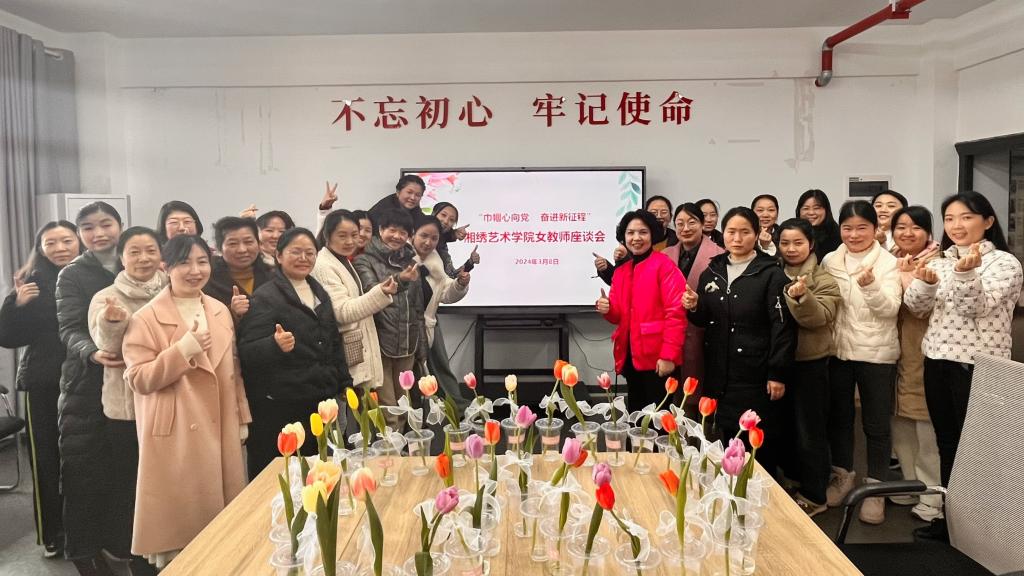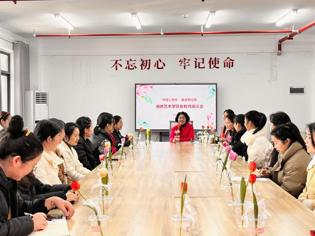 3月7日,为庆祝“三八”国际妇女节,湘绣艺术学院党总支组织女教师开展了“巾帼心向党、奋进新征程”座谈会。座谈会由党总支书记、院长唐利群主持,学院全体女教师欢聚一堂,共话学院发展,共同庆祝节日。