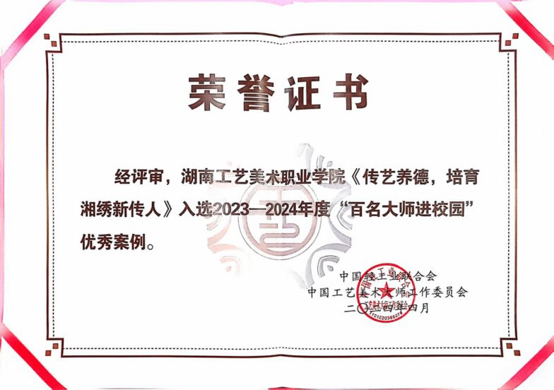 多年来,李艳大师与学院携手打造大师工作室,将实践经验与教育资源相结合,为刺绣艺术的传承与创新注入新活力。她全面参与学院的人才培养、课程体系构建及刺绣创新研发,为学院的高质量人才培养贡献卓越力量。学院以李艳大师为核心的《传艺养德,培育湘绣新传人》案例成功入选“百名大师进校园”优秀案例,彰显了学院在工艺美术教育和文化传承方面的卓越成就。
