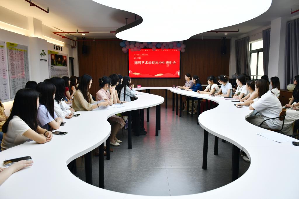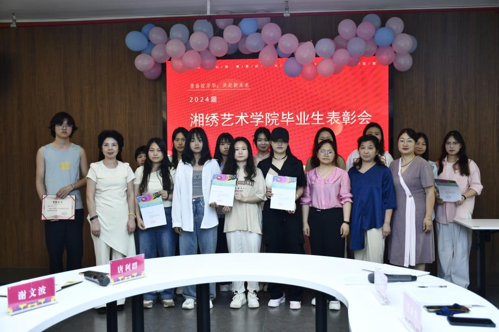6月19日下午,湘绣艺术学院在黄大年式教学团队工作室中隆重举行2024届毕业生表彰大会,学院党总支书记、院长唐利群,副书记蔡胜男,副院长谢文波及辅导员老师、2024届毕业生们齐聚一堂,共同见证这一荣耀时刻。会议由蔡胜男主持。