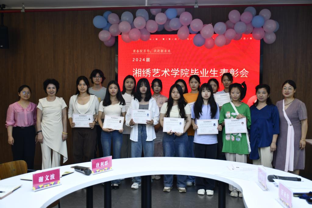 湘绣艺术学院表彰大会在毕业季视频中一声声“记得常回家看看哦……”拉开了帷幕,毕业生们望着视频中由青涩变得成熟的自己,想起三年来的点点滴滴,不经感慨万千。随后进入表彰环节,谢文波宣读了校院二级优秀毕业设计作品、“1+X”手绣制作工(湘绣)职业技能等级水平证书等表彰文件,学院领导为获奖者们颁发了荣誉证书,台下响起阵阵热烈的掌声。毕业生代表高红波发表了感言,她深情地回忆了三年的成长与收获,表达了对母校、师长和同窗们的深深感激之情,并表示将带着母校的期望和嘱托,在未来的人生道路上继续拼搏奋进。教师代表任亚华代表全院教师向2024届全体毕业生致以最美好的祝福,表达了对同学们的不舍和眷恋,并希望他们乘风破浪,继续努力,在今后的人生道路上始终保持对艺术的热爱与追求,书写属于自己的青春篇章。