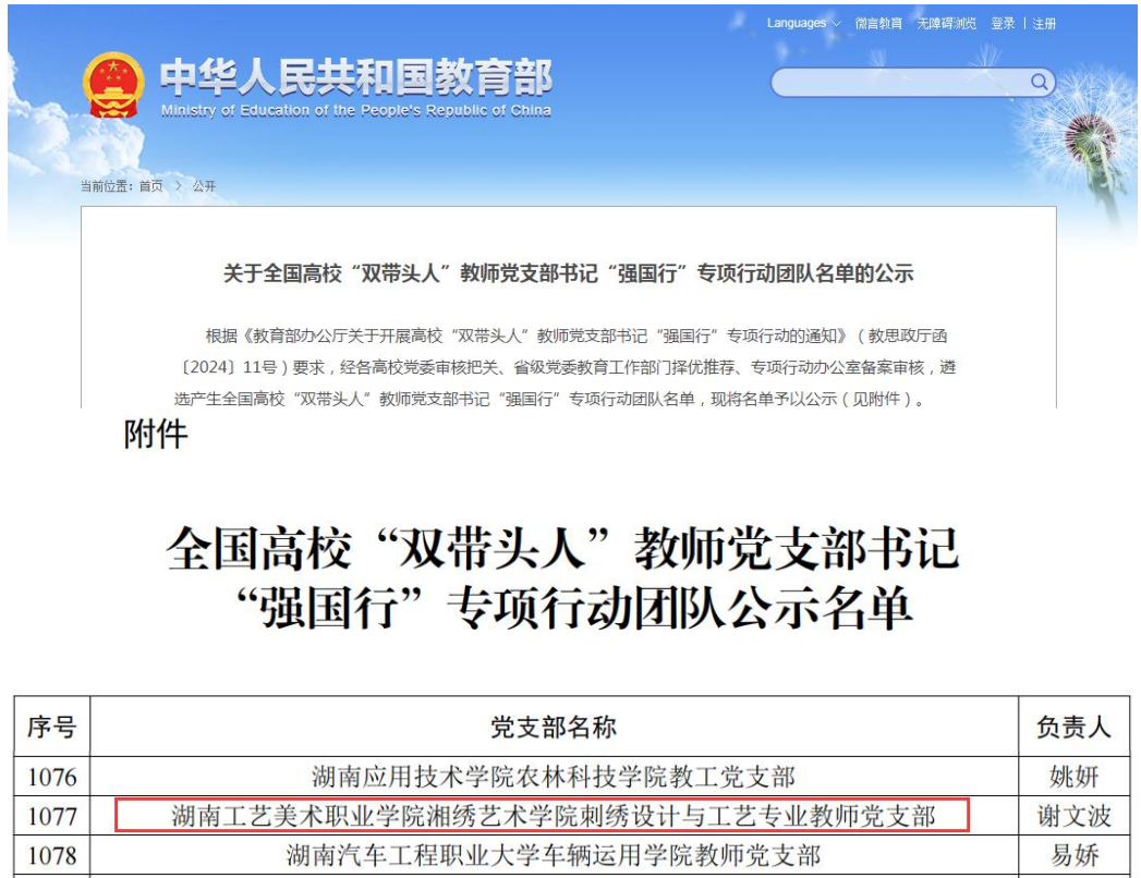 近日,教育部思想政治工作司发布了关于全国高校“双带头人”教师党支部书记“强国行”专项行动团队遴选结果的公示,我校湘绣艺术学院刺绣设计与工艺专业教师党支部成功入选。