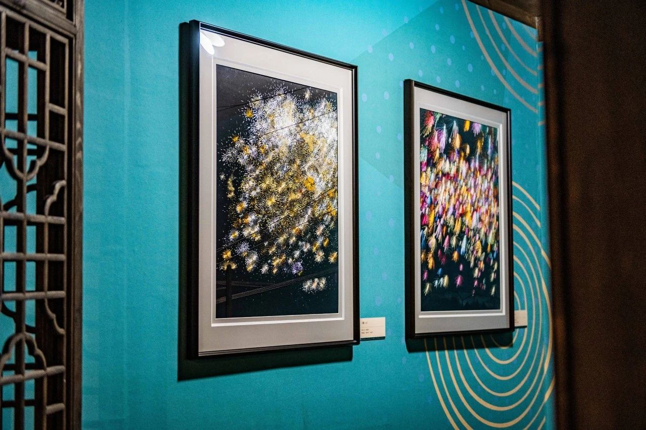 尤为值得一提的是,湘绣艺术学院学生刘兆坤,在黄大年式教师团队的精心指导下,他绣了一幅烟花作品《焰》,他没有直接用黑色缎面,而是用墨汁给白缎着色,有的地方用浓墨,有的地方用淡墨,来凸显烟花的色彩。除了绣织空中绽放的上百朵烟花,刘兆坤还创意性地绣织了电线杆,营造出一种看窗外烟花的感觉,也为绣品增添了人间烟火气。此幅作品不仅展示了湘绣技艺的博大精深,更深刻体现了年轻一代对传统文化的深刻理解与独特创新,因此该作品获得了中央电视台的特别报道。
